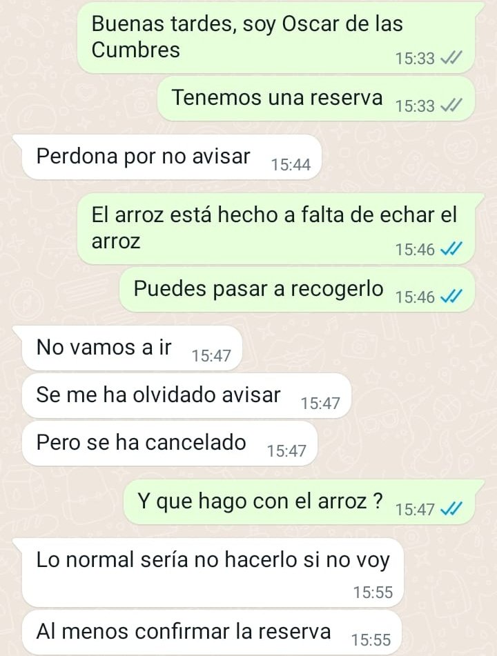 En esta ocasión, la historia comenzó con un mensaje de WhatsApp enviado por un hostelero a un cliente que había reservado mesa. «Buenas tardes, soy Óscar, de Las Cumbres. Tenemos una reserva», fue el inicio de la conversación que más tarde se haría conocida. La respuesta del cliente llegó en forma de disculpa, asegurando que había olvidado avisar. La situación comenzó a tensarse cuando el dueño del local añadió: «El arroz está hecho a falta de echarlo. Puedes pasar a recogerlo».