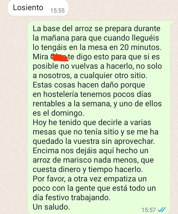 El hostelero decidió explicar por qué este tipo de acciones son problemáticas para su negocio. «La base del arroz se prepara durante la mañana para que cuando lleguéis lo tengáis en la mesa en 20 minutos. Te digo esto para que, si es posible, no vuelvas a hacerlo, no solo a nosotros, sino a cualquier otro sitio», expresó. Sus palabras sintetizaban la frustración de quienes trabajan en un sector exigente y con horarios especiales.