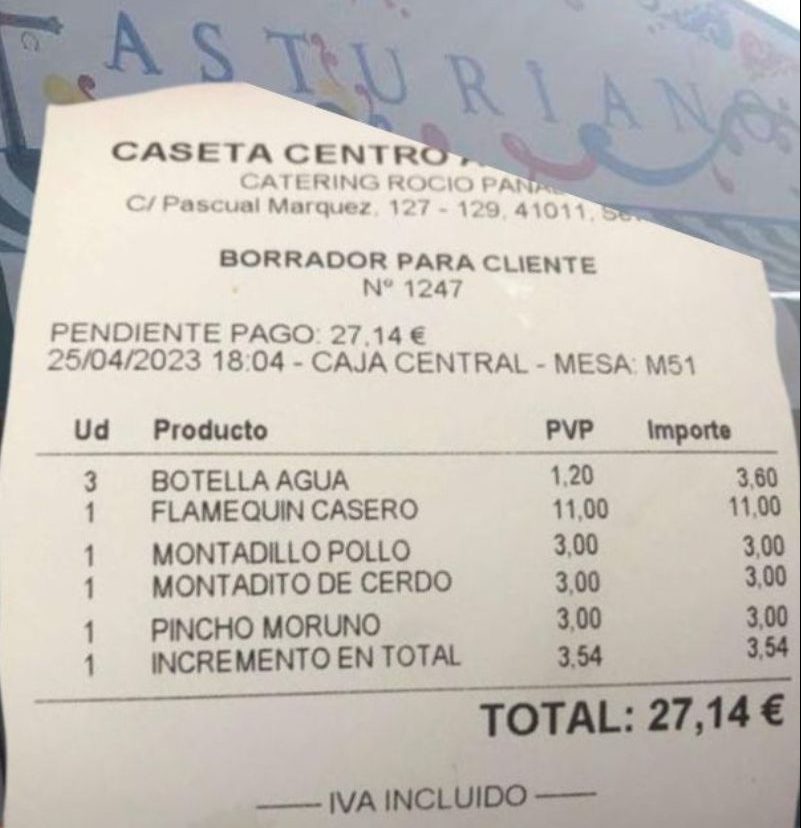 El ticket publicado por Facua muestra consumiciones habituales como botellas de agua, flamenquín casero, montaditos y un pincho moruno. Sin embargo, al final de la factura se indica un cargo adicional de 3,54 euros bajo ese concepto de incremento, que eleva el total a 27,14 euros. “Una de las afectadas indica que cuando pidió que le aclarasen por qué le incluían ese recargo, el camarero se limitó a contestarle ‘por ser Feria’”, ha denunciado la asociación en su comunicado.