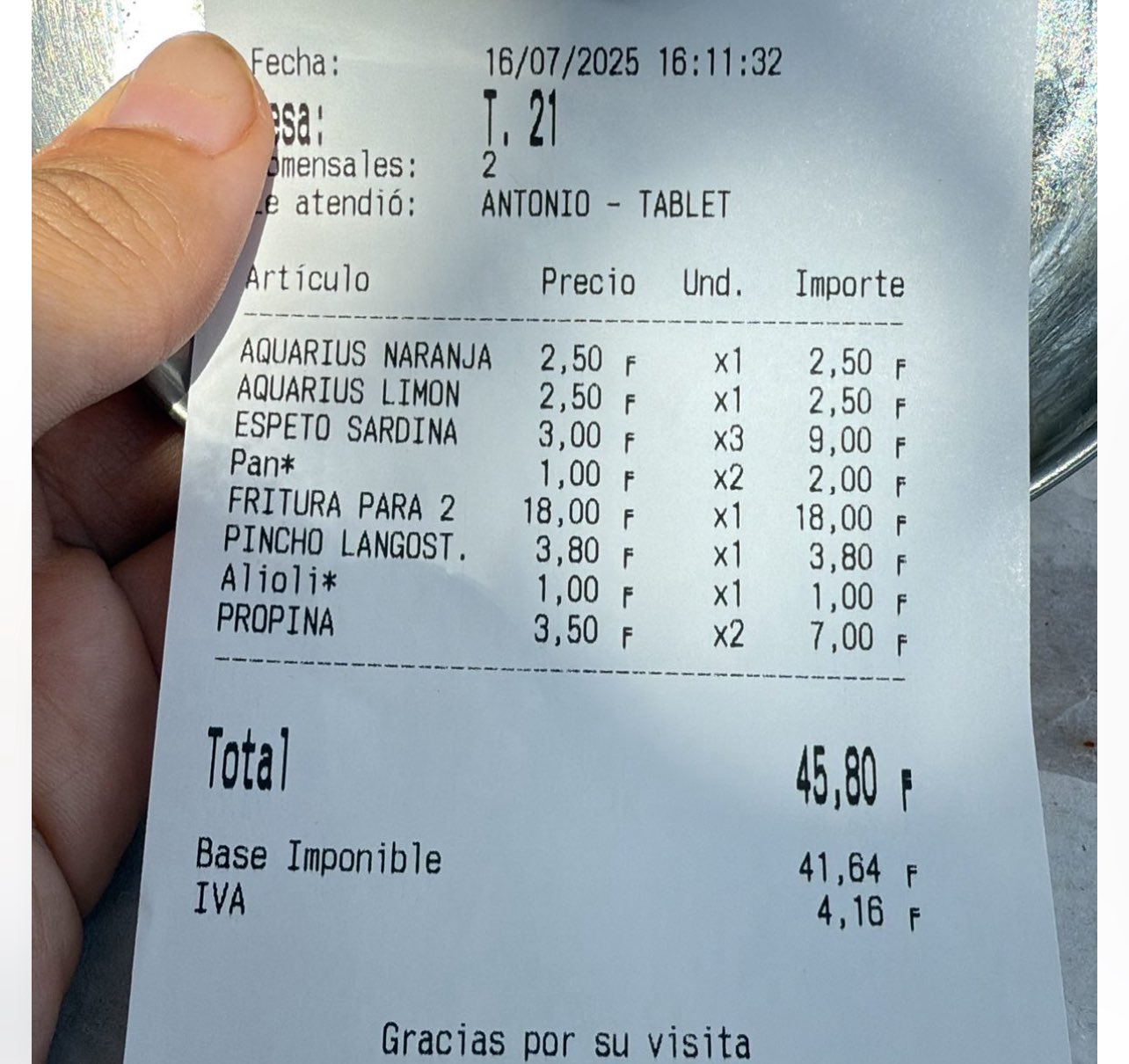 La fotografía que acompaña al mensaje revela el núcleo del escándalo: un ticket de un restaurante del paseo marítimo del Palo, en Málaga. La cuenta incluye dos bebidas, espetos, fritura para dos, un pincho de langostino, pan, alioli… y un concepto que sobresale: «Propina: 3,50 por persona». Para muchos, ese detalle representa una ruptura del acuerdo tácito que siempre ha rodeado la propina en España.