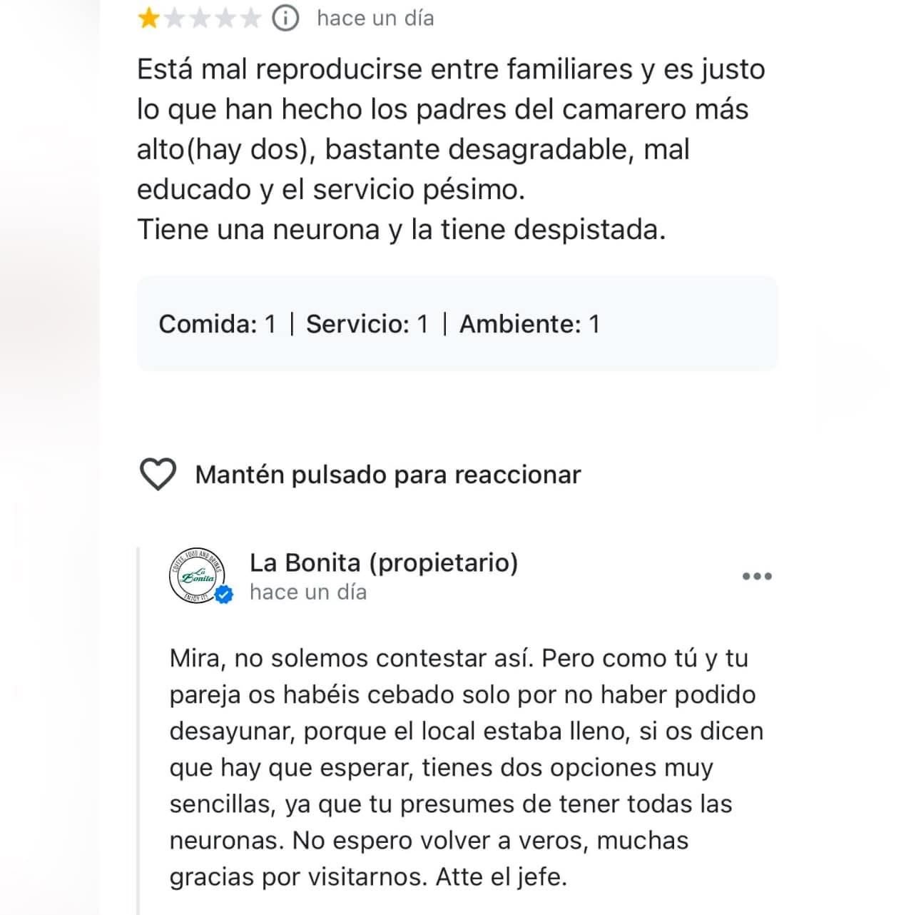 El cliente, visiblemente molesto, no solo criticó la atención sino que lanzó comentarios hirientes sobre el camarero, calificándolo de «desagradable, mal educado y con una sola neurona». Además, incluyó un ataque personal al afirmar: «Está mal reproducirse entre familiares y es justo lo que han hecho los padres del camarero más alto». Estas palabras incendiarias no tardaron en captar la atención, no solo de la comunidad digital sino también del propietario del establecimiento, quien decidió no quedarse callado.