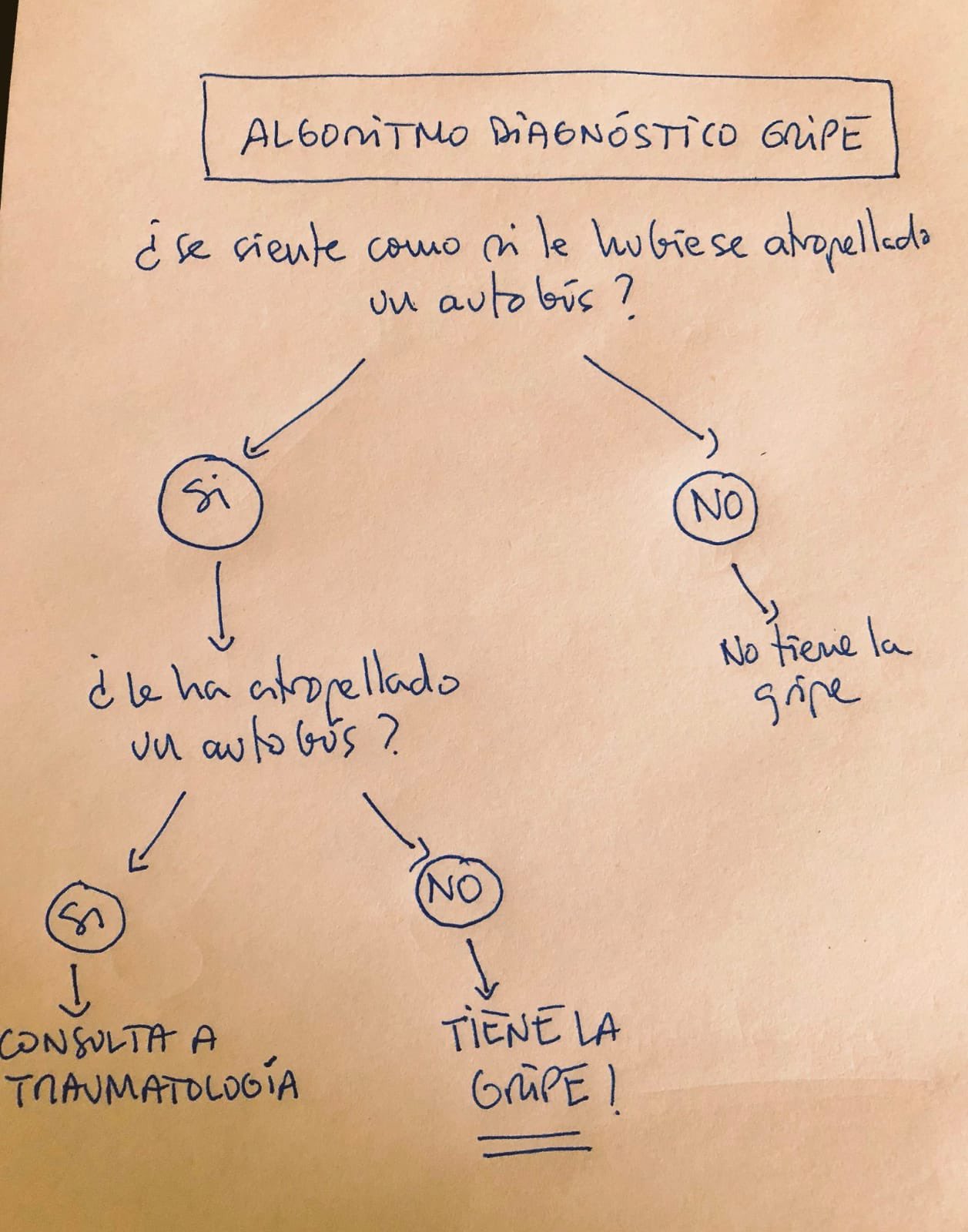 El esquema es claro: todo comienza con una pregunta directa. «¿Se siente como si le hubiese atropellado un autobús?» Si la respuesta es no, la gripe queda descartada. Pero si es afirmativa, el algoritmo lanza otra pregunta igual de ingeniosa: «¿Le ha atropellado un autobús?»