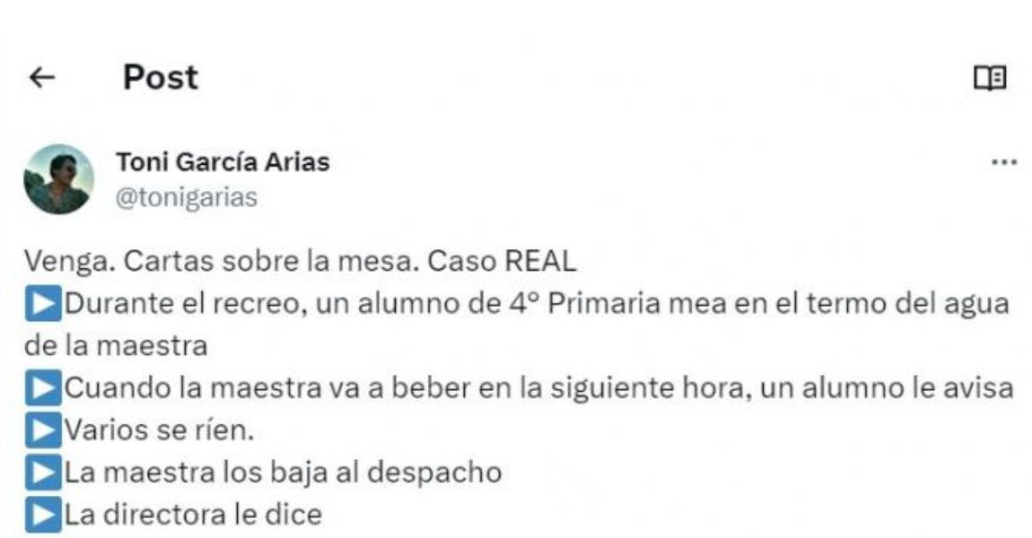 García Arias cuenta que un alumno de 4º de Primaria hizo pis en el termo del agua de su profesora durante un recreo. Cuando la profesora fue a beber en la siguiente hora, otro alumno le avisó de lo que había pasado. Algunos compañeros se rieron de la situación. La profesora llevó a los alumnos al despacho de la directora, pero esta le restó importancia al asunto.