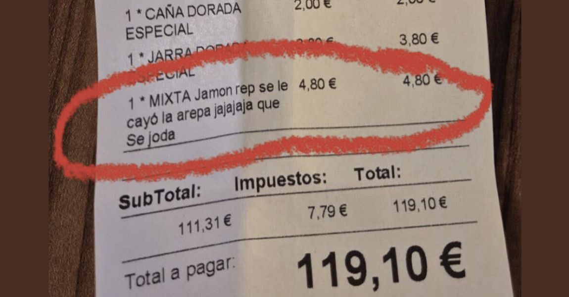Lo que ha revelado Soriano, sin embargo, supera cualquier límite razonable. En su publicación, muestra una fotografía de un ticket donde el último concepto fue modificado por un empleado del establecimiento. El texto que aparece no corresponde con ningún plato reconocible en la carta ni en ningún restaurante civilizado: