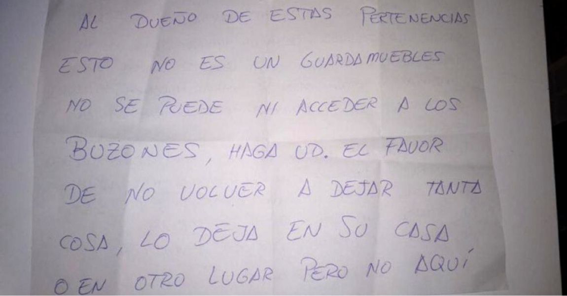 Según se ve en las fotos, el nuevo vecino dejó algunas de sus pertenencias en el pasillo mientras hacía la mudanza. Esto provocó el enfado de otro vecino, que le dejó una nota muy directa: “Al dueño de estas pertenencias: esto no es un guardamuebles, no se puede ni acceder a los buzones. Haga usted el favor de no volver a dejar tanta cosa, lo deja en su casa o en otro lugar pero no aquí”.