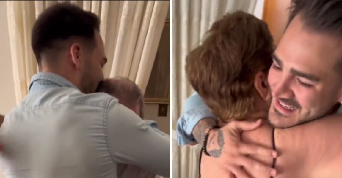 Al ver a su hijo, los padres se quedan atónitos y sin palabras. El joven les saluda con un cariñoso “¿Qué fue gallega?” a su madre, que no puede creer lo que ve. Después de unos segundos de incredulidad, los padres se lanzan a abrazar a su hijo con lágrimas en los ojos, mientras él les dice que los extrañaba mucho.