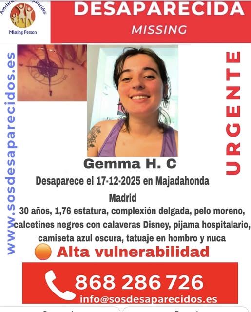 En este contexto se inscribe la reciente comunicación de la asociación SOS Desaparecidos, que ha activado una alerta en la Comunidad de Madrid. La entidad informó de la desaparición de Gemma H. C., una mujer de 30 años cuyo rastro se perdió el miércoles 17 de diciembre de 2025. La información se difundió a través de sus canales digitales, lo que provocó una rápida reacción. La situación fue calificada como especialmente delicada.