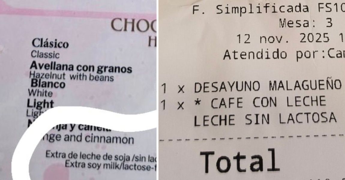 La pregunta venía acompañada de dos imágenes. La primera mostraba el típico tique de bar: «mesa 3, desayuno malagueño por 3,50 euros, café con leche a cero euros» y un remate final que descoloca por completo: “leche sin lactosa: 0,20€». Ahí estaba el recargo. Pequeño, casi invisible, pero lo bastante potente como para detonar un debate nacional sobre la vida, la lactosa y la contabilidad hostelera.