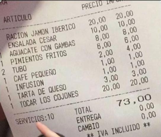 En esta ocasión, la cuenta del restaurante incluía platos comunes como jamón, ensalada, pimientos, varios postres y café. Nada fuera de lo normal, hasta que el cliente detectó un cargo adicional inesperado: 20 euros extra bajo el concepto “tocar los cojones”. Con ese añadido, el coste final se disparaba de 53 a 73 euros. Un recargo que no solo desconcertó a los comensales, sino que rápidamente desató una tormenta digital.