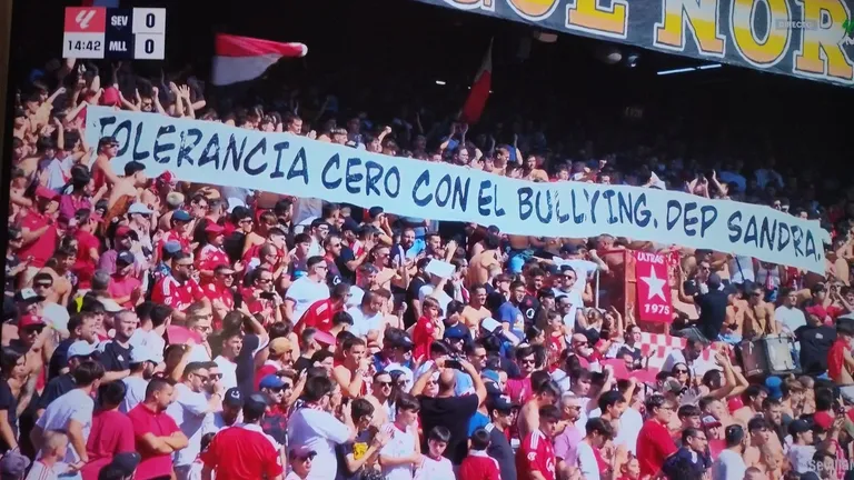 Durante el encuentro entre el Sevilla FC y el Mallorca, el público del Ramón Sánchez Pizjuán guardó unos instantes de respeto por Sandra Peña, una joven sevillana cuya muerte ha dejado consternada a toda Andalucía. Desde la grada del Gol Norte, los hinchas desplegaron un mensaje claro y sentido: “Tolerancia cero. DEP, Sandra”. No hubo ruido, solo aplausos y miradas que buscaban consolar lo inconsolable.