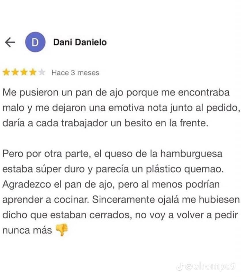 Lejos de agradecer el gesto del negocio, el cliente dejó una reseña negativa en la plataforma online en la que criticaba la calidad de la comida. El hombre escribió: “Me pusieron un pan de ajo porque me encontraba malo y me dejaron una emotiva nota junto al pedido, daría a cada trabajador un besito en la frente. Pero por otra parte, el queso de la hamburguesa estaba súper duro y parecía un plástico quemao. Agradezco el pan de ajo, pero al menos podrían aprender a cocinar. Sinceramente ojalá me hubiesen dicho que estaban cerrados, no voy a volver a pedir nunca más”.