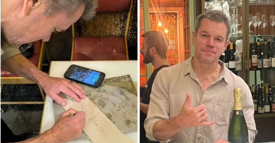 Damon no dudó en participar y escribió un mensaje cargado de humor que rápidamente se difundió en redes: «¡Que te den Alejo, tienes que trabajar más!». Poco después, el restaurante compartió la anécdota en Instagram junto con fotos del intérprete y la famosa nota. «Cuando Matt Damon viene a casa (nos encantaría ser uno de sus restaurantes favoritos de Barcelona), intentamos que cene ‘Denarices’ Aunque pueda echar de menos a uno de los dueños», publicaron en la descripción.
