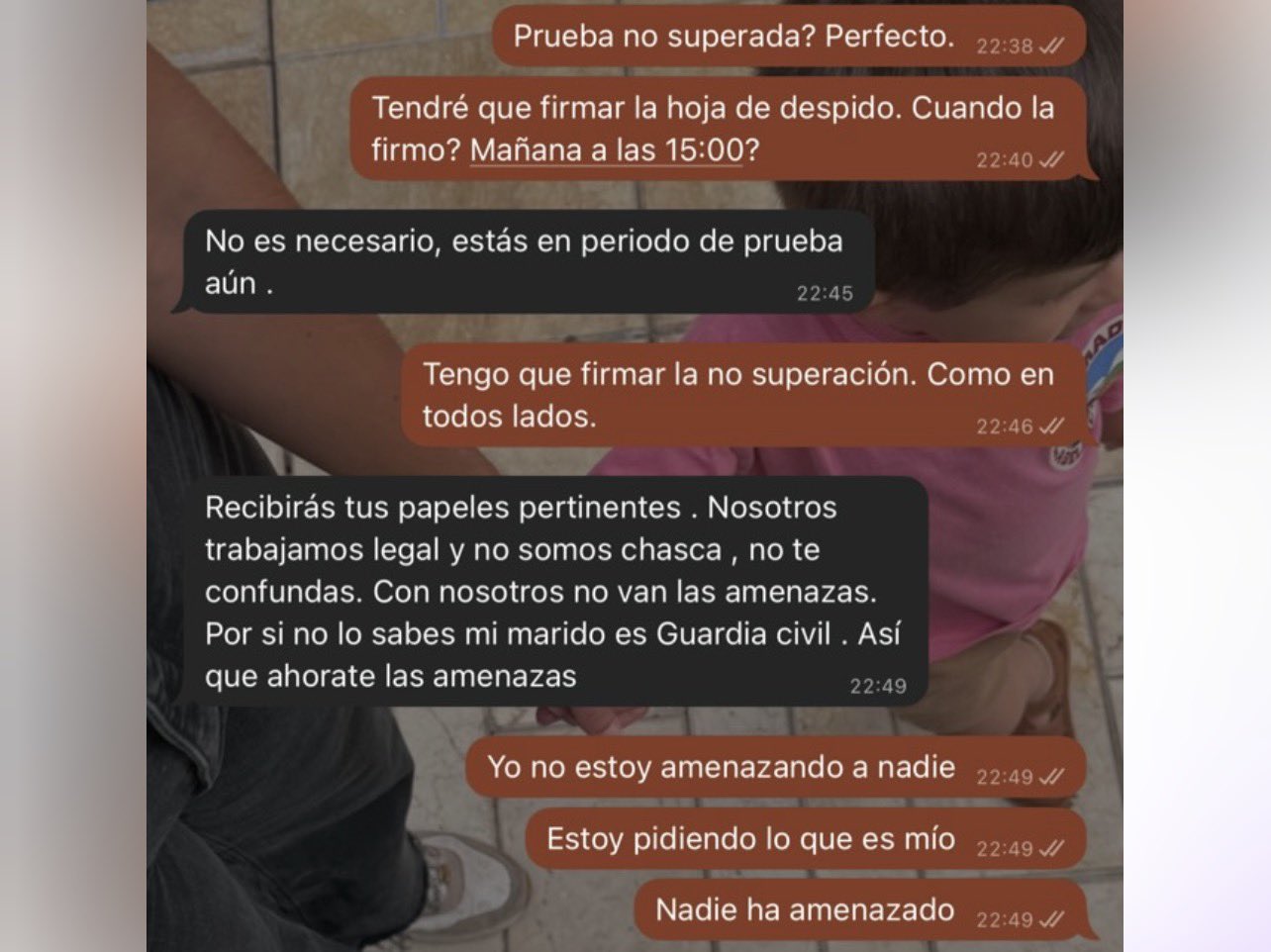 “no valen las amenazas, que mi marido es Guardia Civil”, escribió la jefa, en un intento de imponerse apelando a la autoridad de otra persona. Esa frase terminó de encender los ánimos de los usuarios en redes, que no tardaron en calificar el comportamiento de inadmisible. El camarero, lejos de dejarlo pasar, mantuvo su posición hasta el final.
