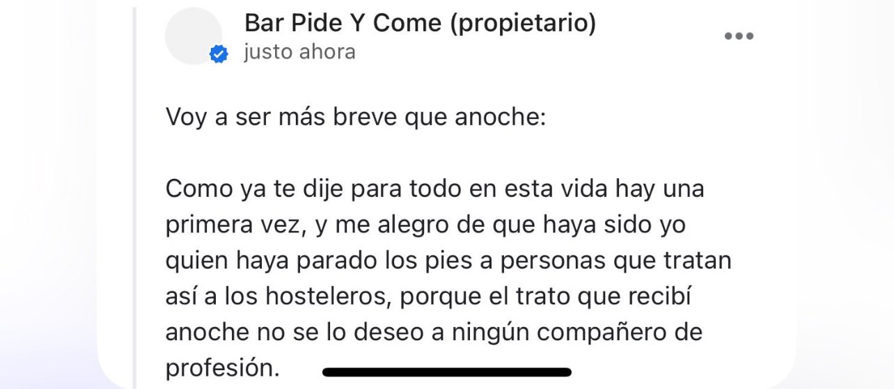 No hubo malentendido ni confusión, según se desprende del cruce de versiones compartido por Soriano: simplemente se levantaron para seguir buscando otro sitio para comer. Unos quince minutos después, sin mesa en el bar vecino, decidieron regresar al mismo establecimiento como si nada. Paco, lejos de morderse la lengua, les negó la atención y les pidió que se marcharan. «Aquí damos un servicio, no somos siervos», publicó más tarde en redes. «El cliente no siempre tiene la razón», remató con firmeza.
