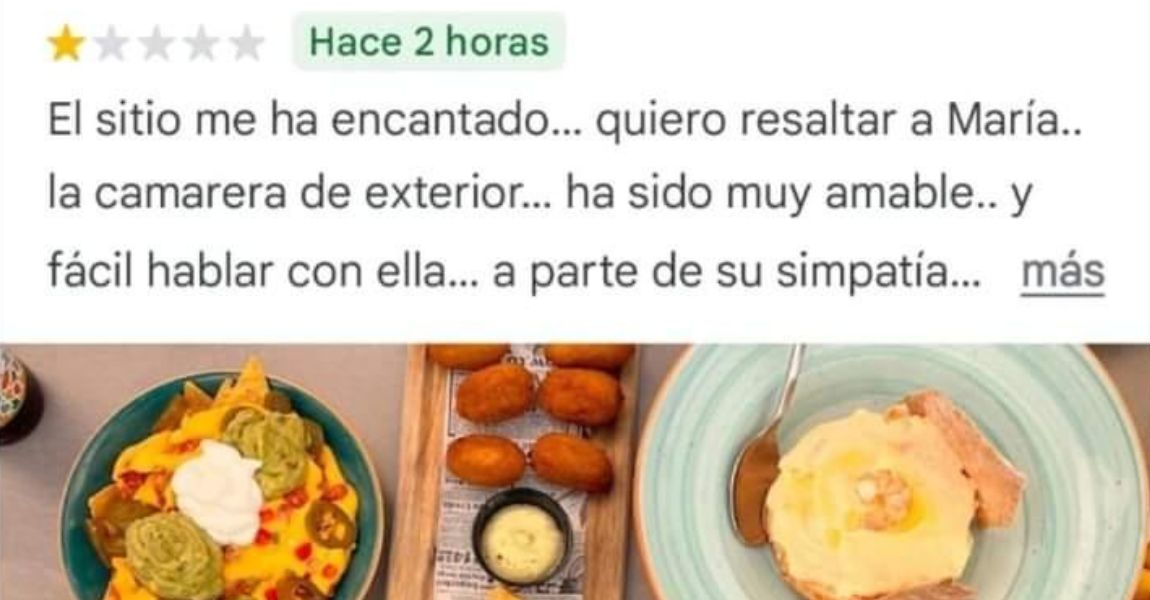 La clienta, que se identifica como María, alaba en su comentario la atención de la camarera que les sirvió en la terraza, a la que califica de “muy amable y fácil hablar con ella, a parte de su simpatía”. Sin embargo, solo le da una estrella al local, quizá porque no le gustó el detalle de que les cobraran por lo que habían consumido.