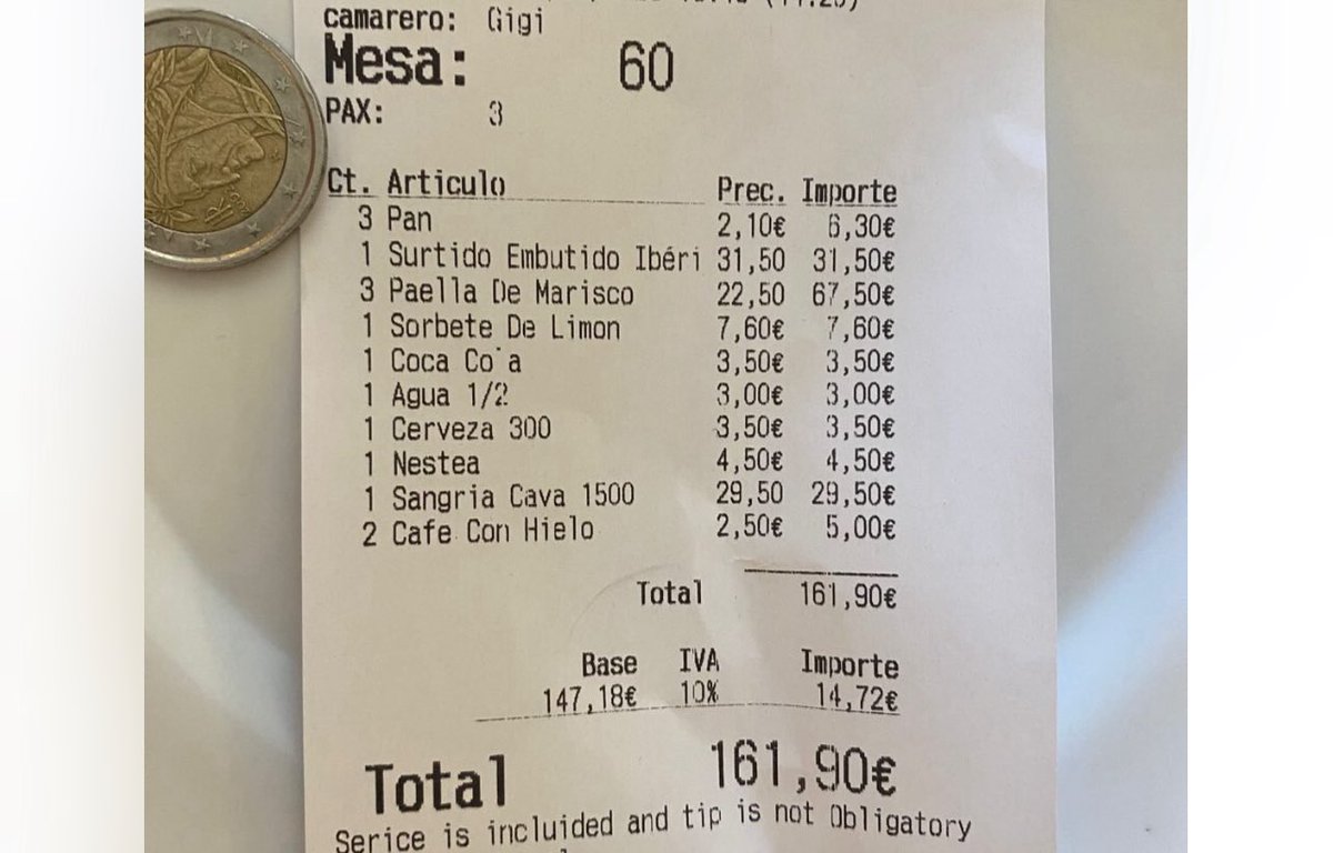 Más allá del pan, el ticket en cuestión refleja una comida típica de verano en cualquier punto turístico de España: tres paellas de mariscos, un surtido de embutido ibérico y bebidas varias como agua, cerveza y café con hielo. Todos los precios, según el análisis compartido por Soriano, eran razonables teniendo en cuenta la temporada estival. Sin embargo, fue ese pequeño suplemento por el pan el que desató las críticas.
