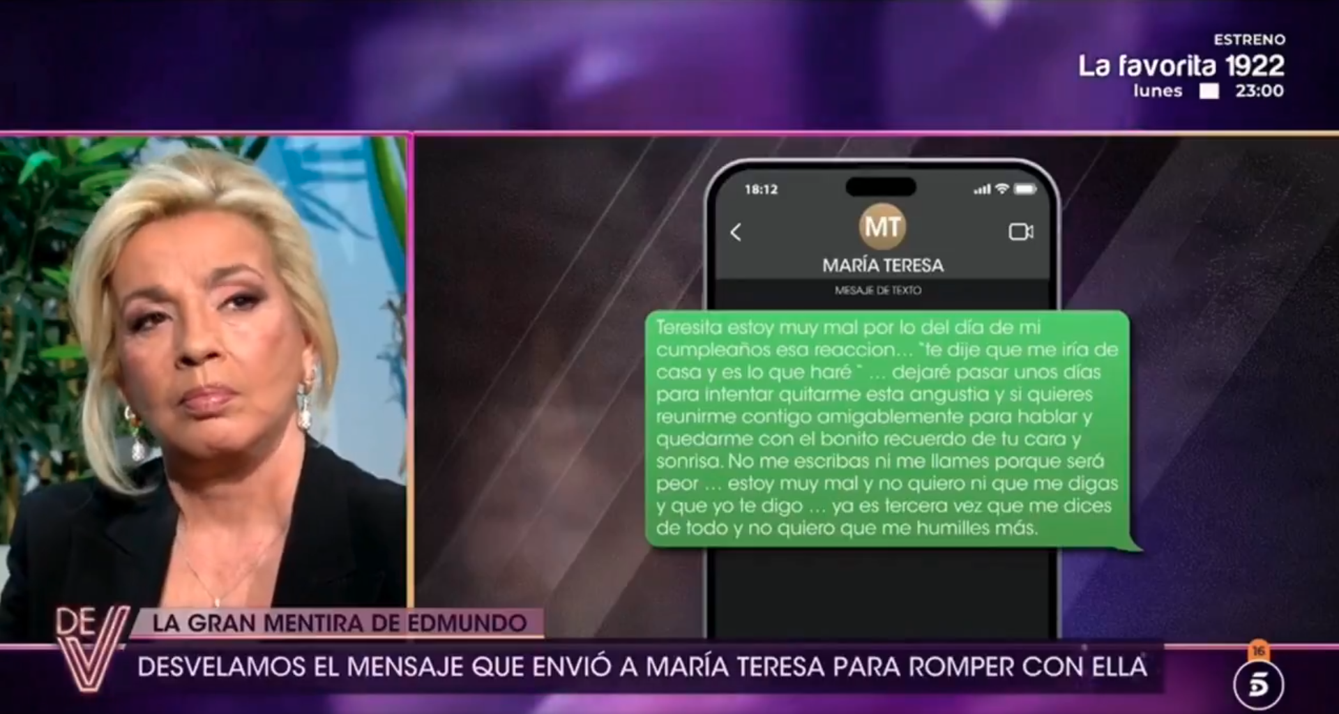 Antonio Rossi, colaborador del programa, fue el encargado de dar lectura al mensaje que desmontaba la versión de Bigote Arrocet. “Ha llegado el momento de quitar la careta y que la gente sepa lo que pasó”, sentenció antes de revelar el texto que María Teresa recibió en su móvil.