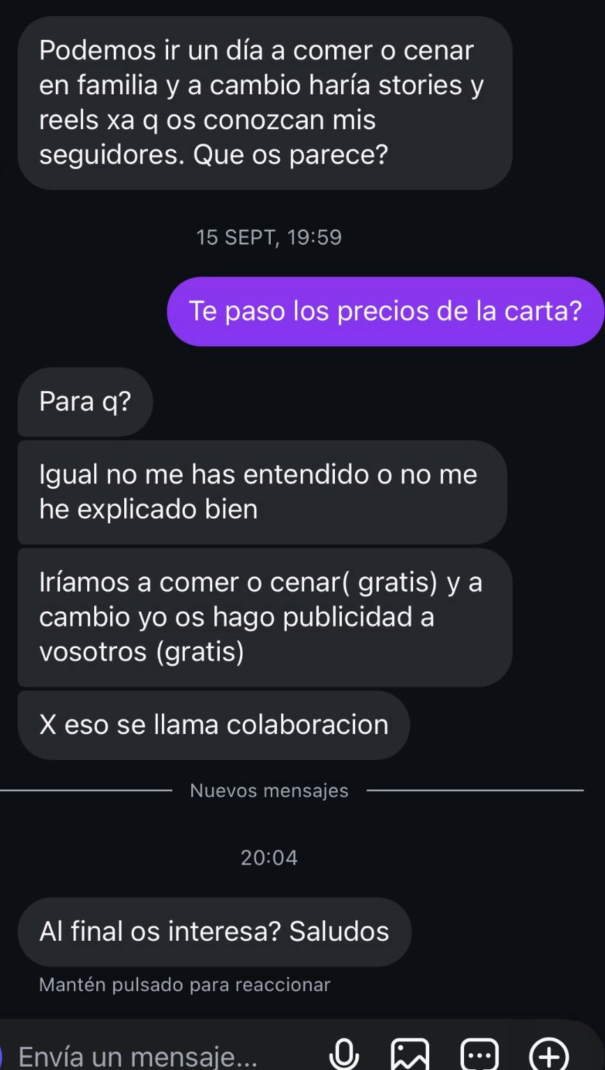Sorprendido por la negativa, el influencer volvió a insistir: «¿Para qué?» y añadió que quizás no se había explicado bien. En un nuevo intento, remató: «¿Iríamos a comer o cenar (gratis) y a cambio yo os hago publicidad a vosotros (gratis). Por eso se llama colaboración.» Pero esta vez, el restaurante ya no respondió.