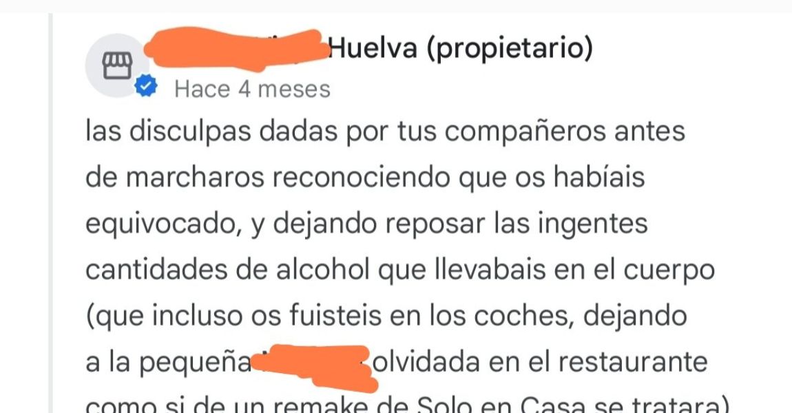 «Lamentamos leer su reseña después del lamentable espectáculo que disteis ayer. Pensamos que después de las disculpas dadas por tus compañeros antes de marcharos, reconociendo que os habíais equivocado, y dejando reposar las ingentes cantidades de alcohol que llevabais en el cuerpo. Incluso os fuisteis en los coches, dejando a la pequeña olvidada en el restaurante como si de un remake de Solo en casa se tratara», respondía el local.