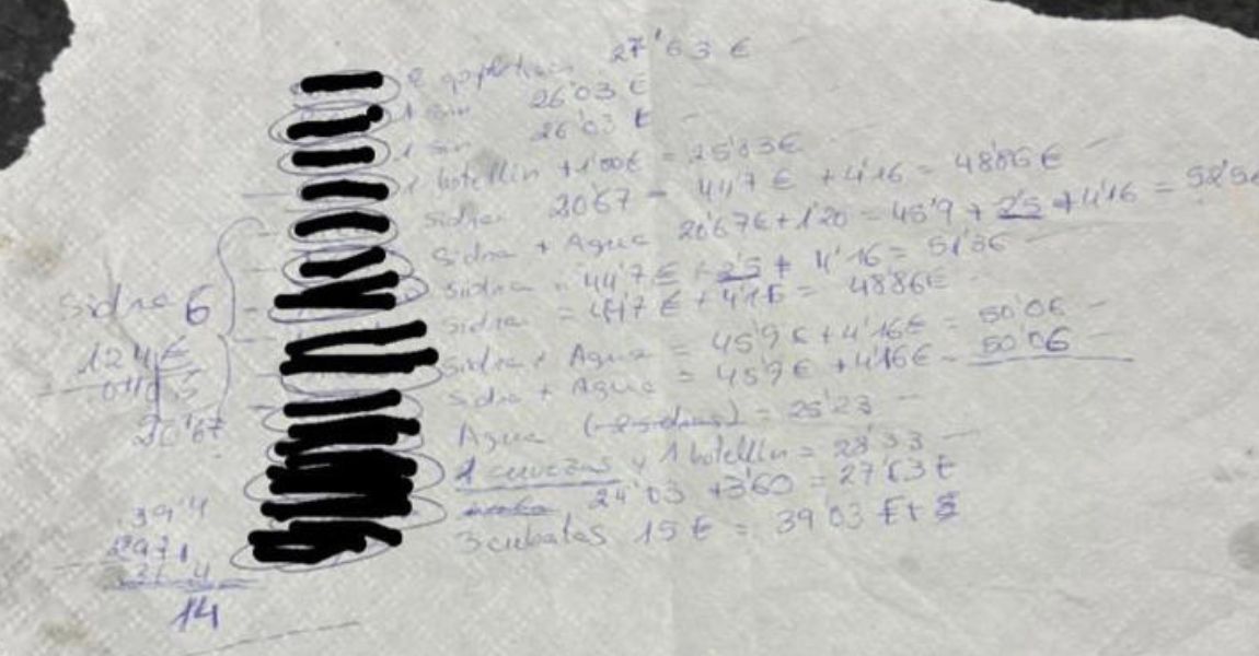 El mensaje iba acompañado de una imagen que dejó a muchos con los ojos como platos, sobre todo a quienes no eran precisamente brillantes en Matemáticas durante el colegio. En un trozo de mantel improvisado, el personal del local anotó los nombres de los 15 comensales y, junto a cada uno, el total de lo que había consumido. El resultado: una hoja caótica e ininteligible que ha generado un intenso debate en redes sociales.